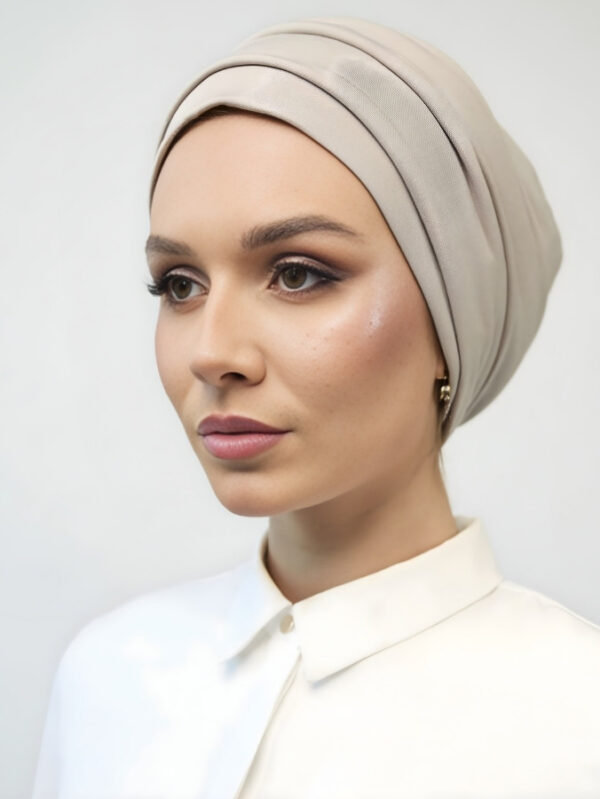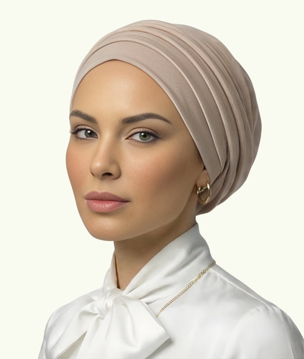 A two-piece turban designed for everyday comfort and style. Adjustable inner button to fit all head sizes. Made from a soft cotton and lycra blend. The second piece can be worn optionally to add volume and provide extra stability.