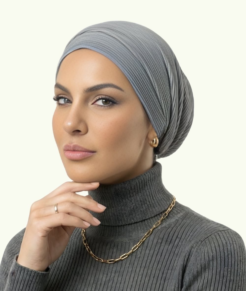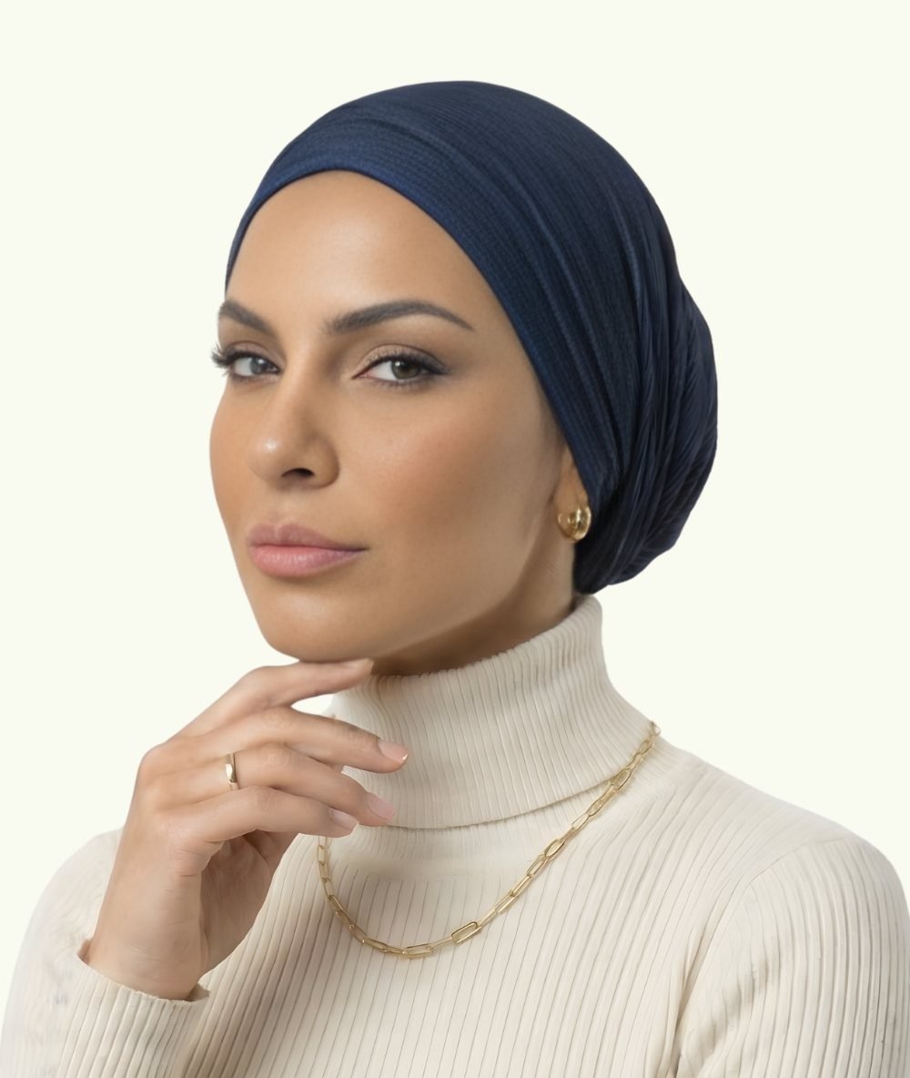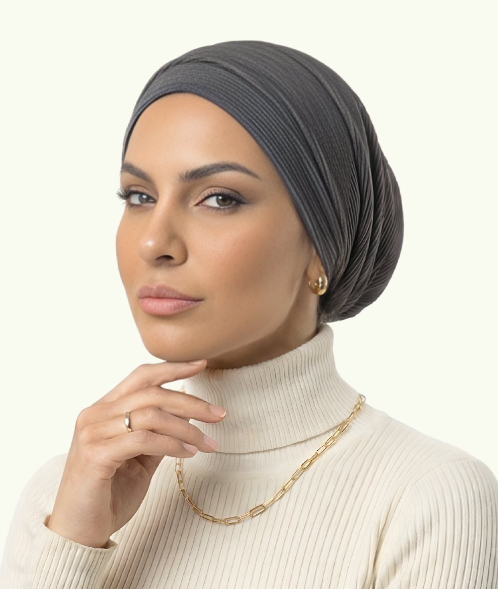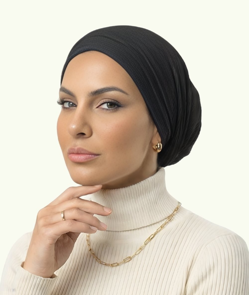 A one-piece pleated turban designed with two long wrap extensions. Allows you to create volume and enhance the overall design. Made from a breathable cotton and Lycra blend that offers flexibility and a secure fit.