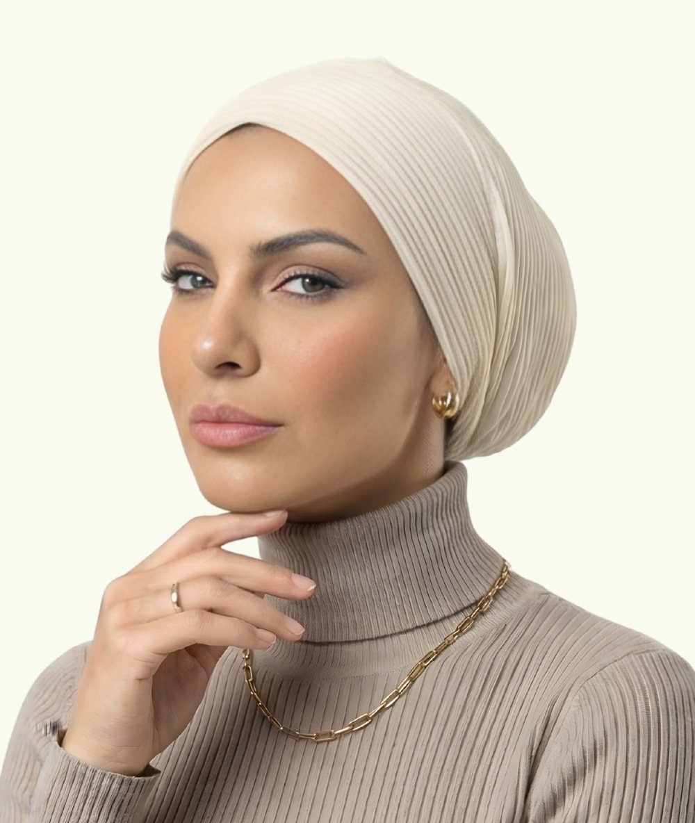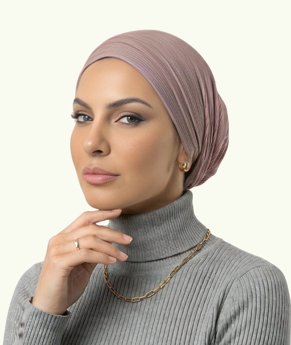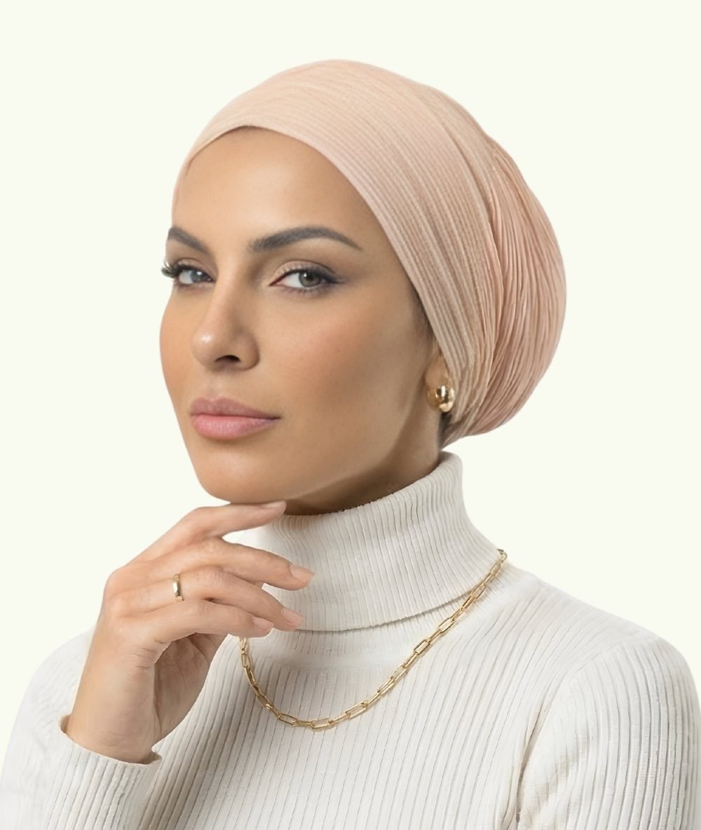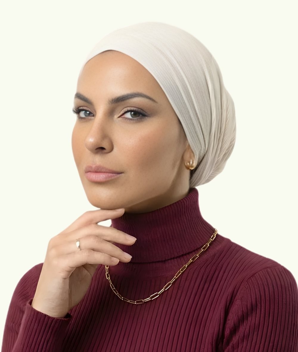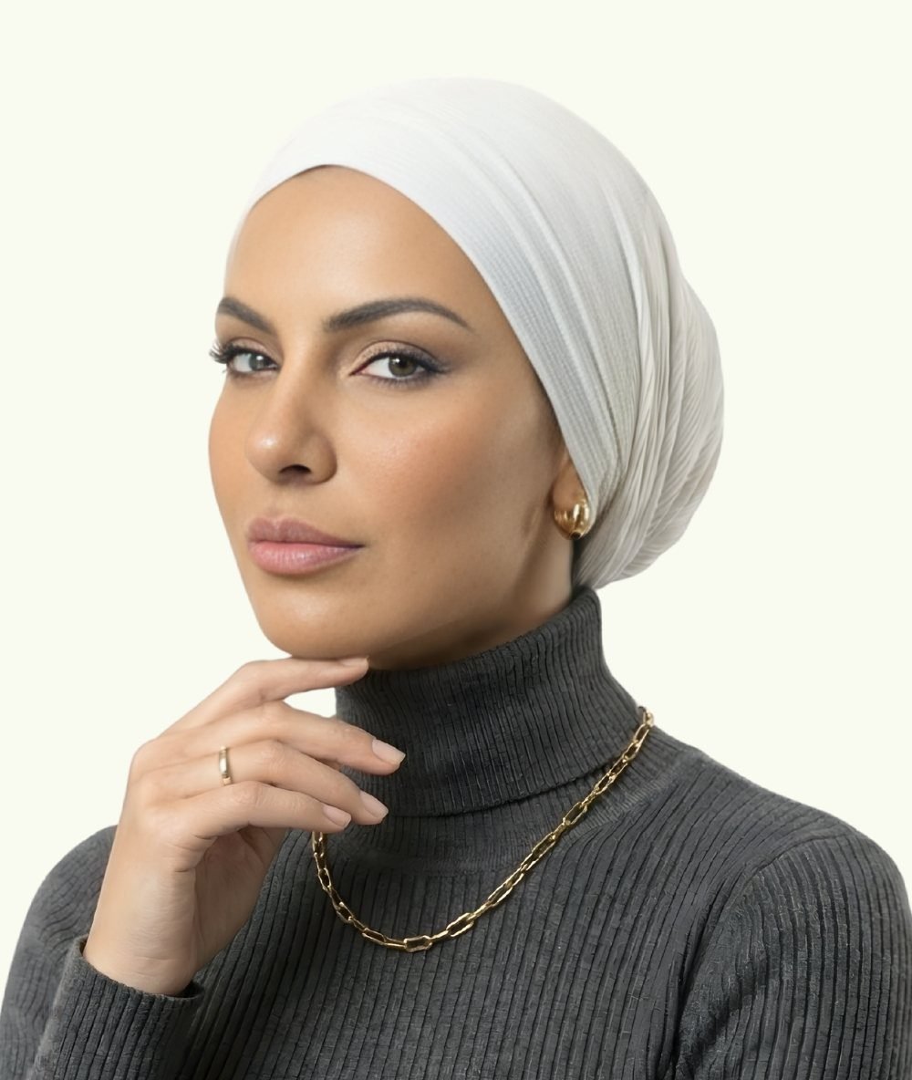 A one-piece pleated turban designed with two long wrap extensions. Allows you to create volume and enhance the overall design. Made from a breathable cotton and Lycra blend that offers flexibility and a secure fit.