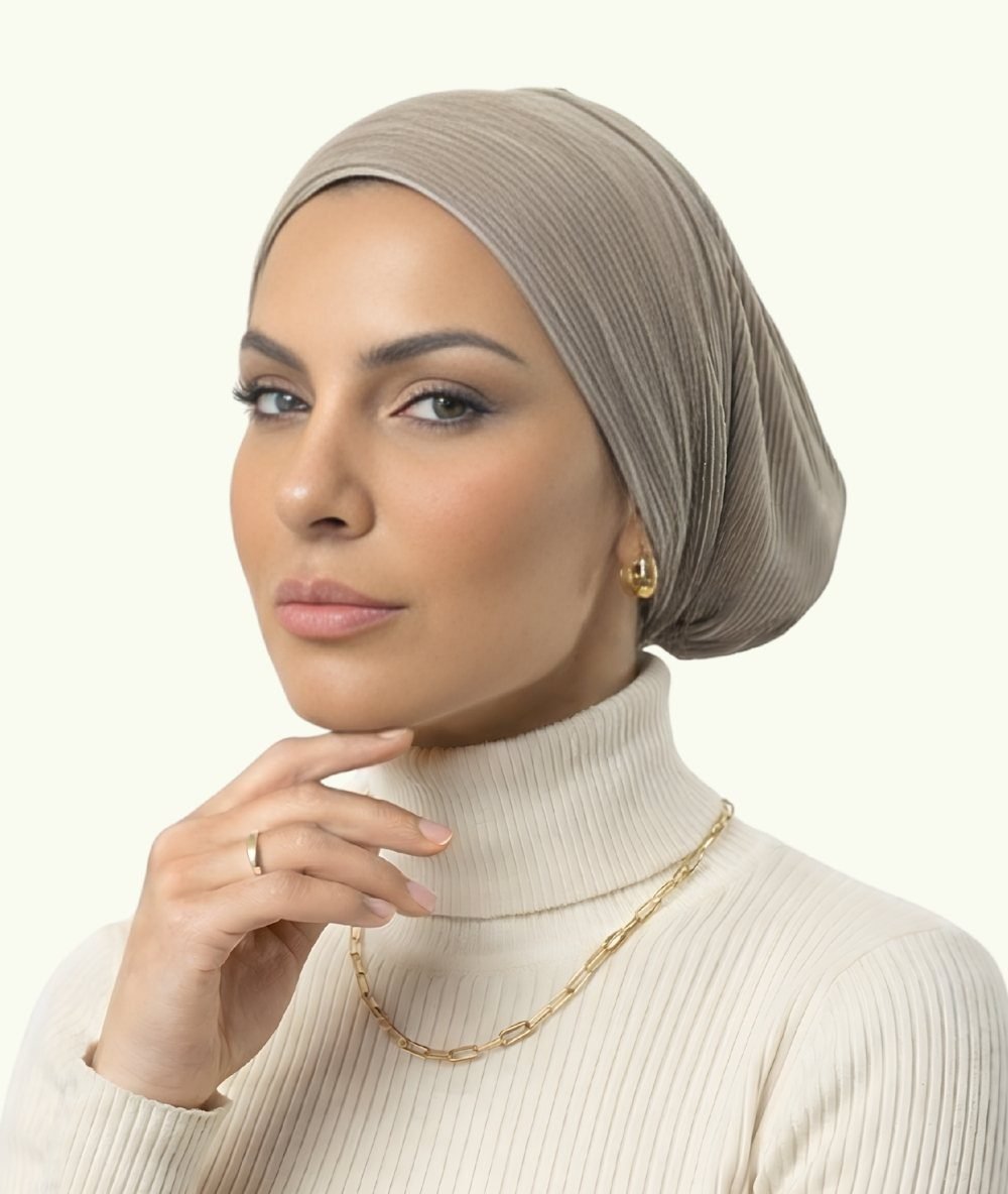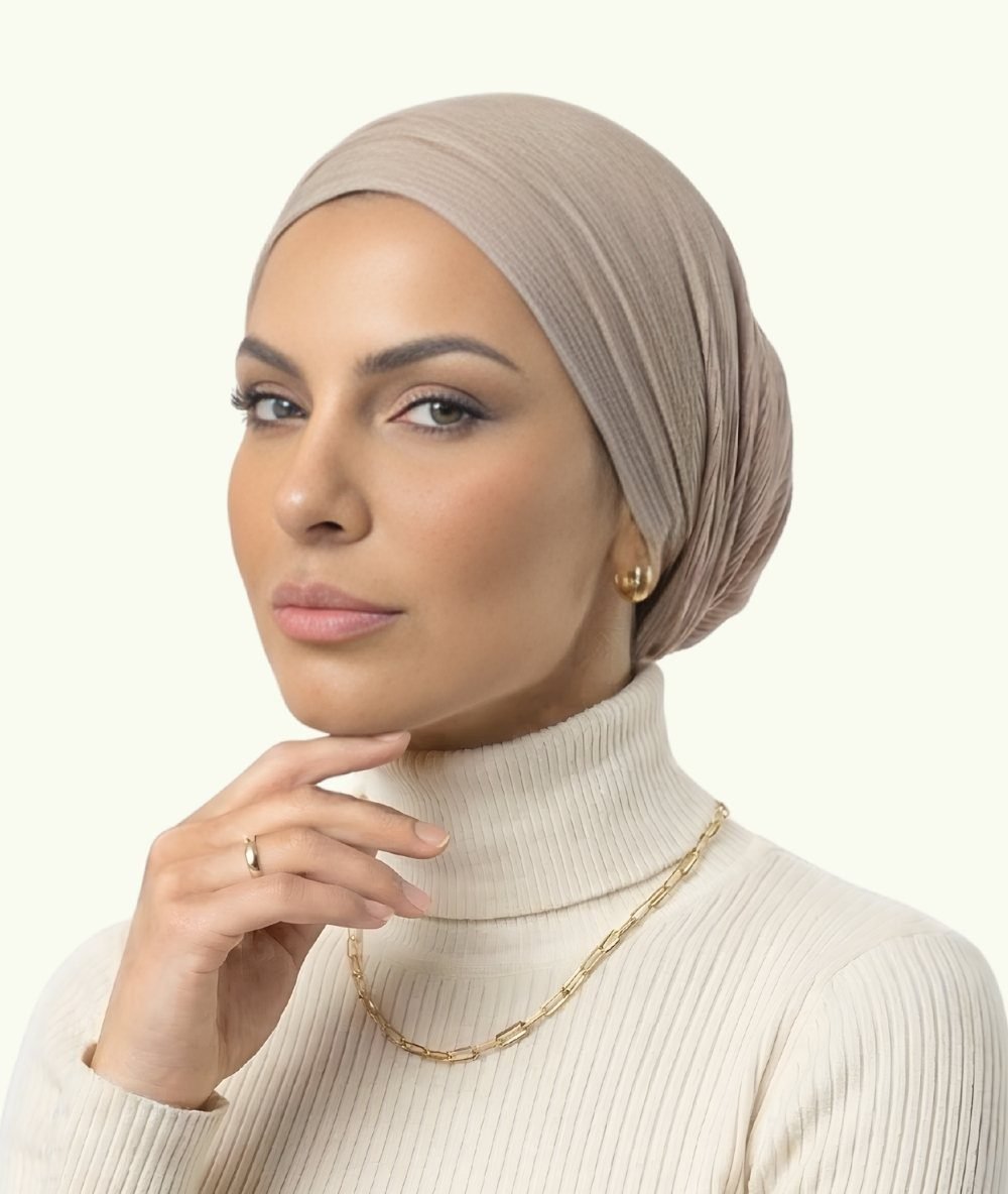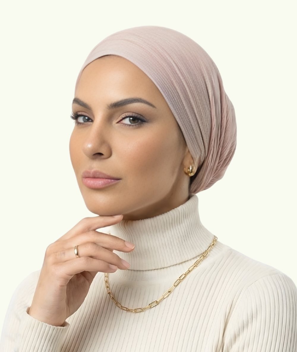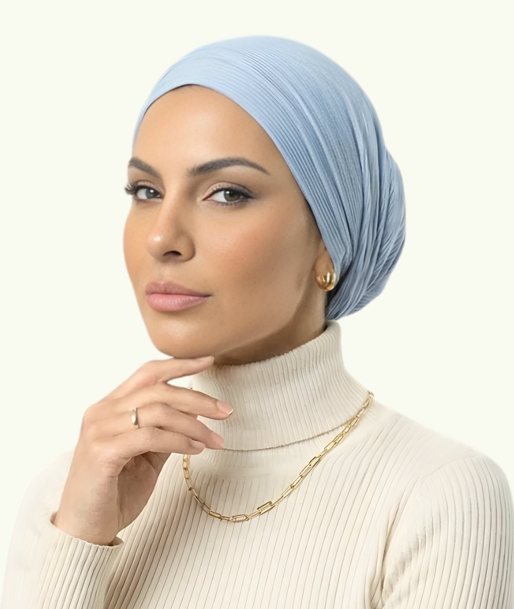 A one-piece pleated turban designed with two long wrap extensions. Allows you to create volume and enhance the overall design. Made from a breathable cotton and Lycra blend that offers flexibility and a secure fit.