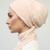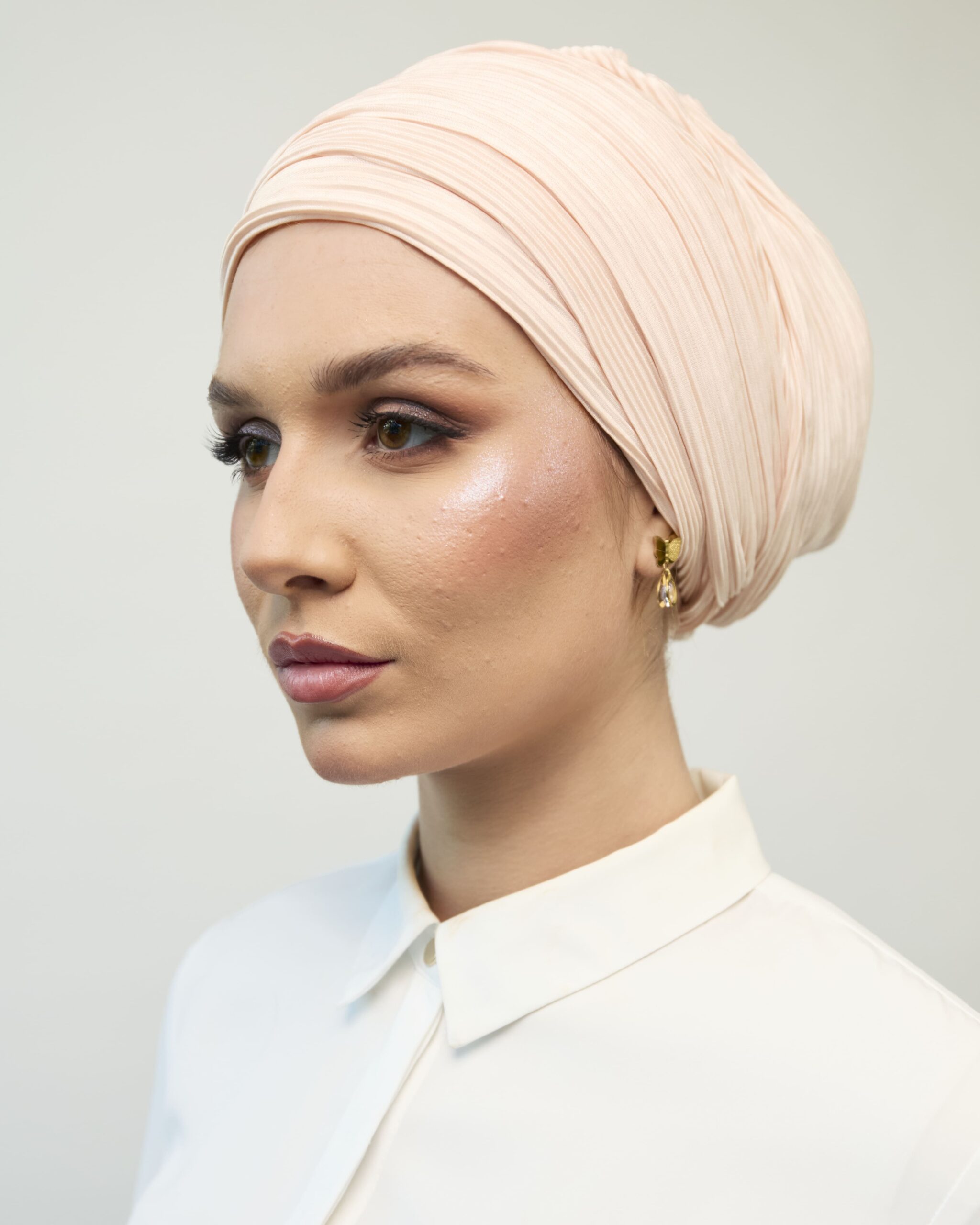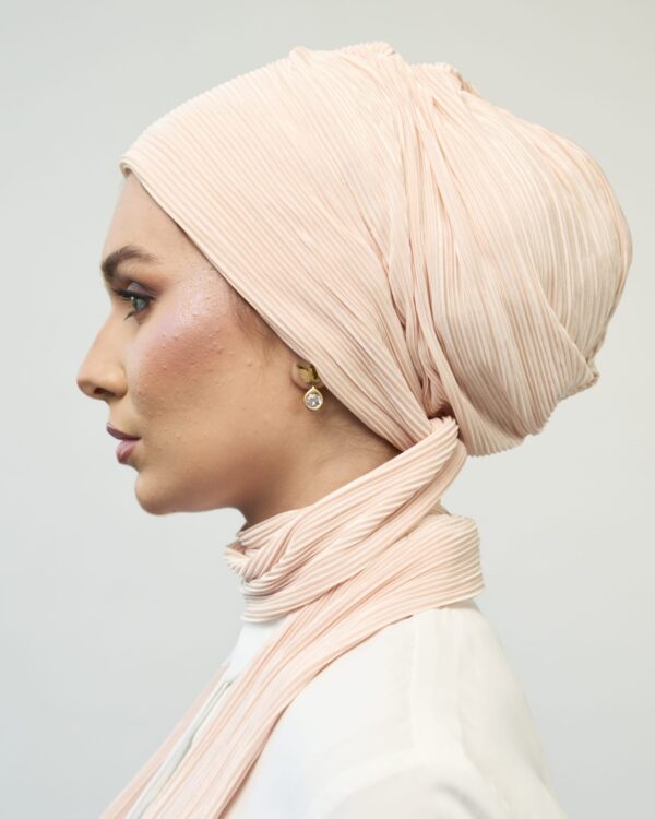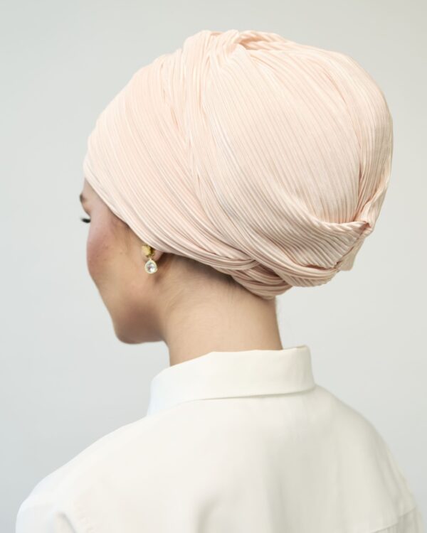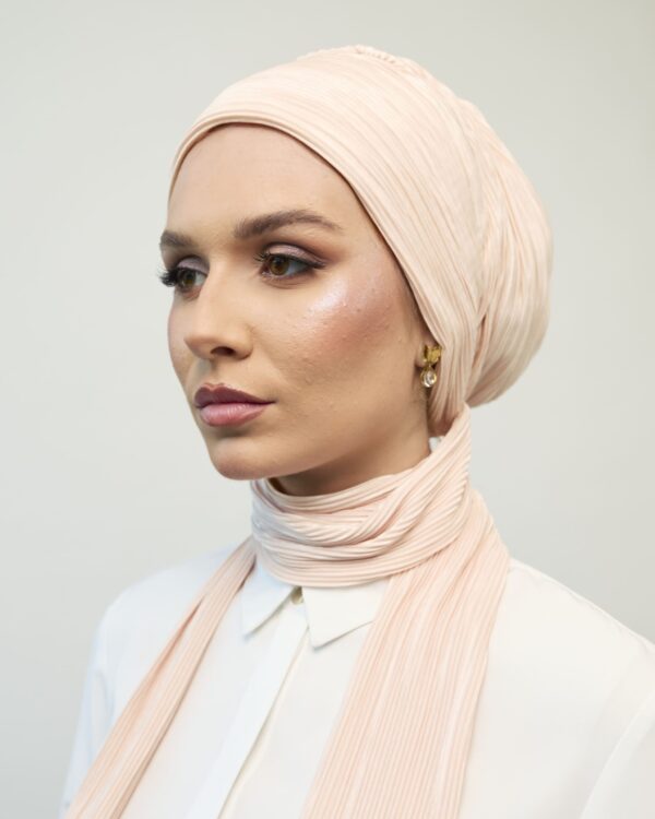 A multi-style turban made of pleated fabric that can be worn and styled in a variety of situations and methods It can be worn elegantly or casually and is suitable for day and night wear. In addition to all that, it can be worn in 3 different ways: firstly, by tying both scarves around the head and having a hat style; secondly, by tying one scarf on the head and the other left around the neck; and finally, by tying both scarves on the neck!